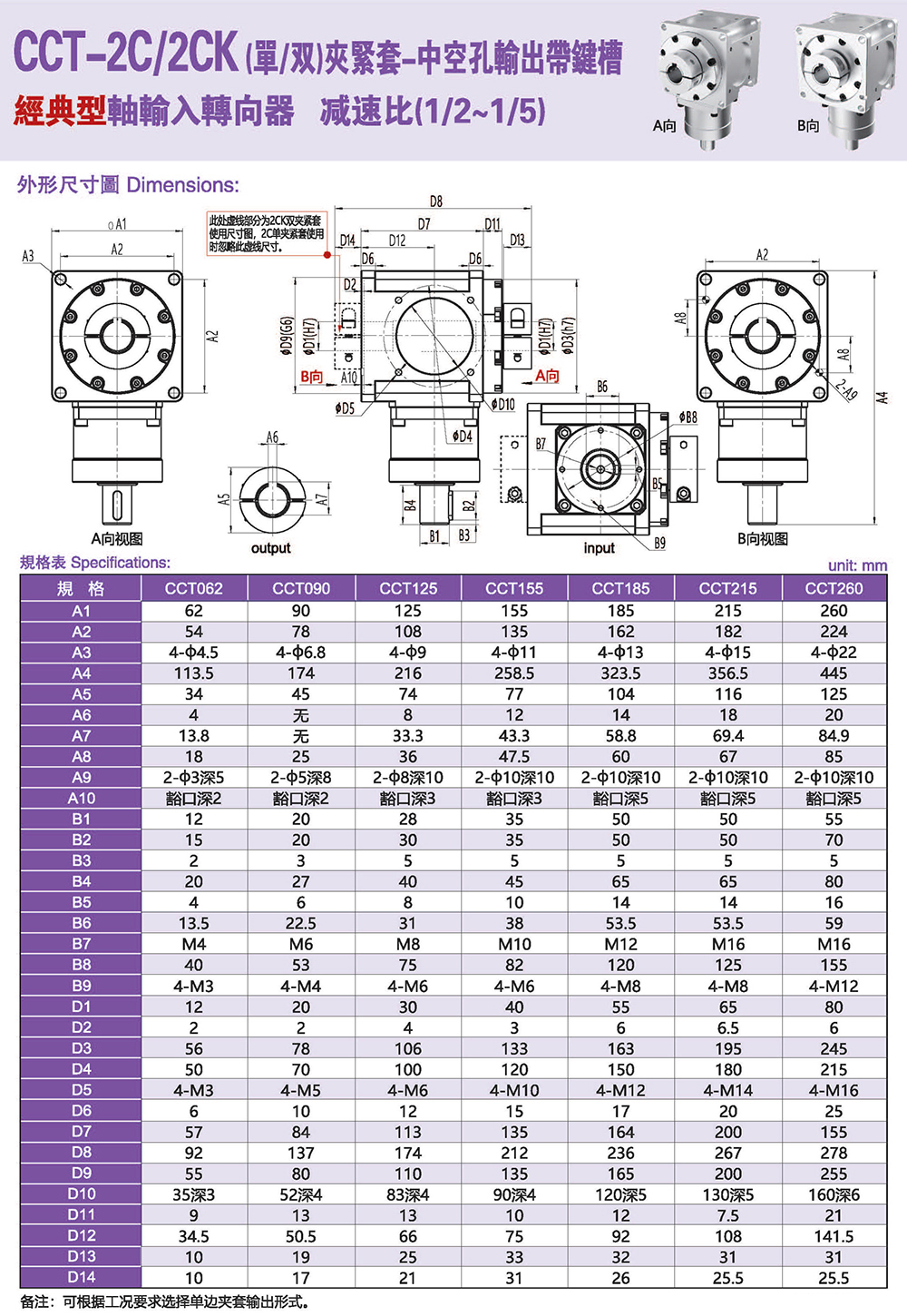 多樣化:輸出軸種類多樣化,有單出力軸型、雙出力軸型、中空軸型、中空法蘭型、中空軸錐形緊迫性、螺桿直線型、螺牙直線型。