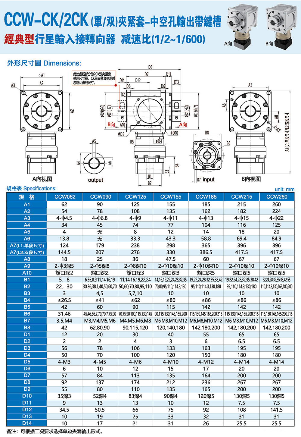 多樣化:輸出軸種類多樣化,有單出力軸型、雙出力軸型、中空軸型、中空法蘭型、中空軸錐形緊迫性、螺桿直線型、螺牙直線型。