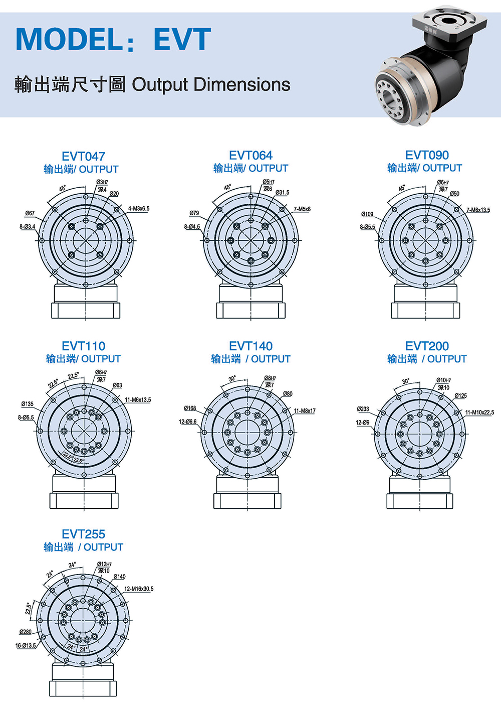 多樣化:輸出軸種類多樣化,有單出力軸型、雙出力軸型、中空軸型、中空法蘭型、中空軸錐形緊迫性、螺桿直線型、螺牙直線型。