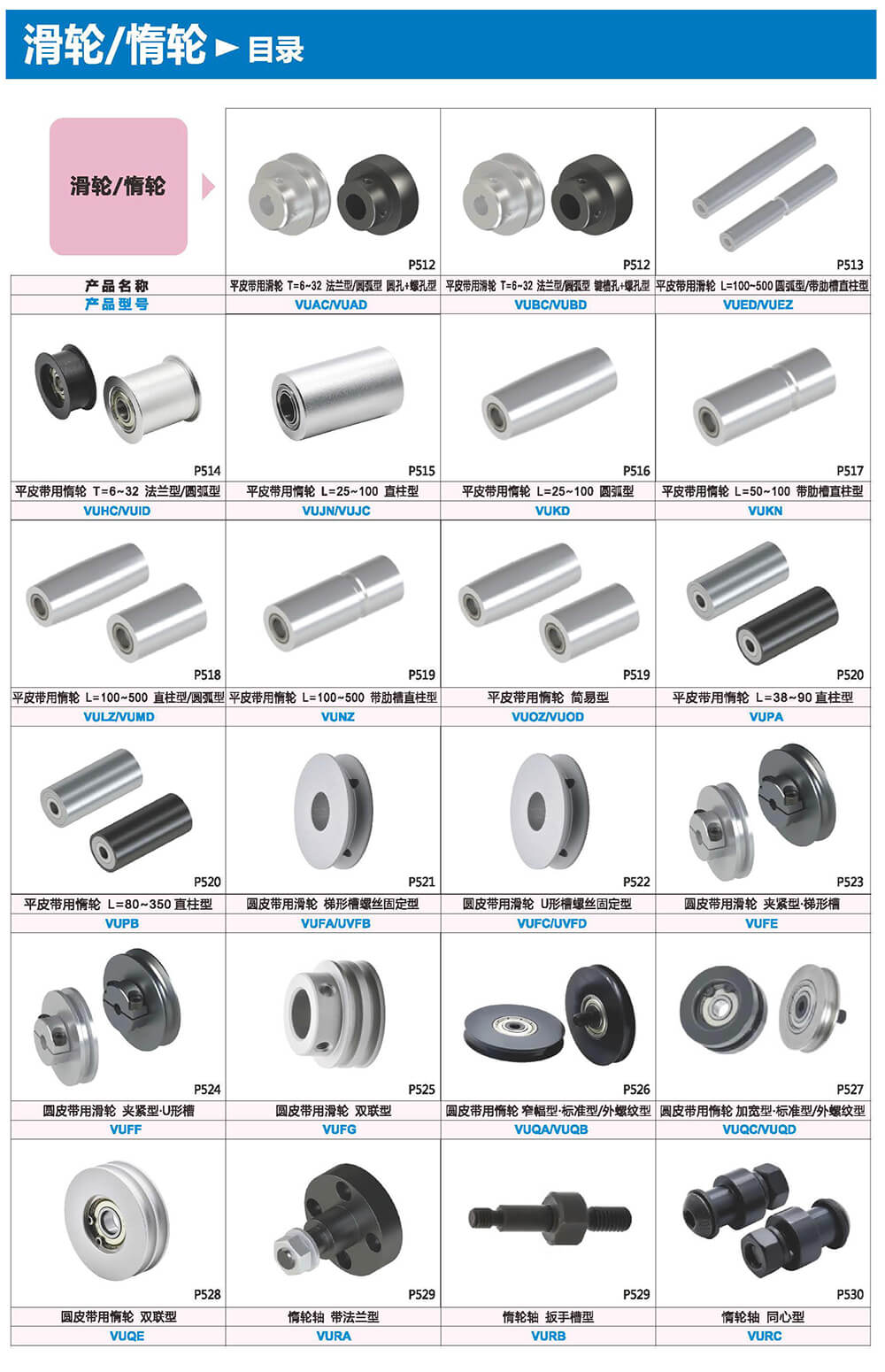 滑輪惰輪在機械設(shè)備中與平皮帶圓皮帶配合使用,起到動力傳遞、輸出、過渡、皮帶張緊用等,用于皮帶張緊時也可稱作張緊輪