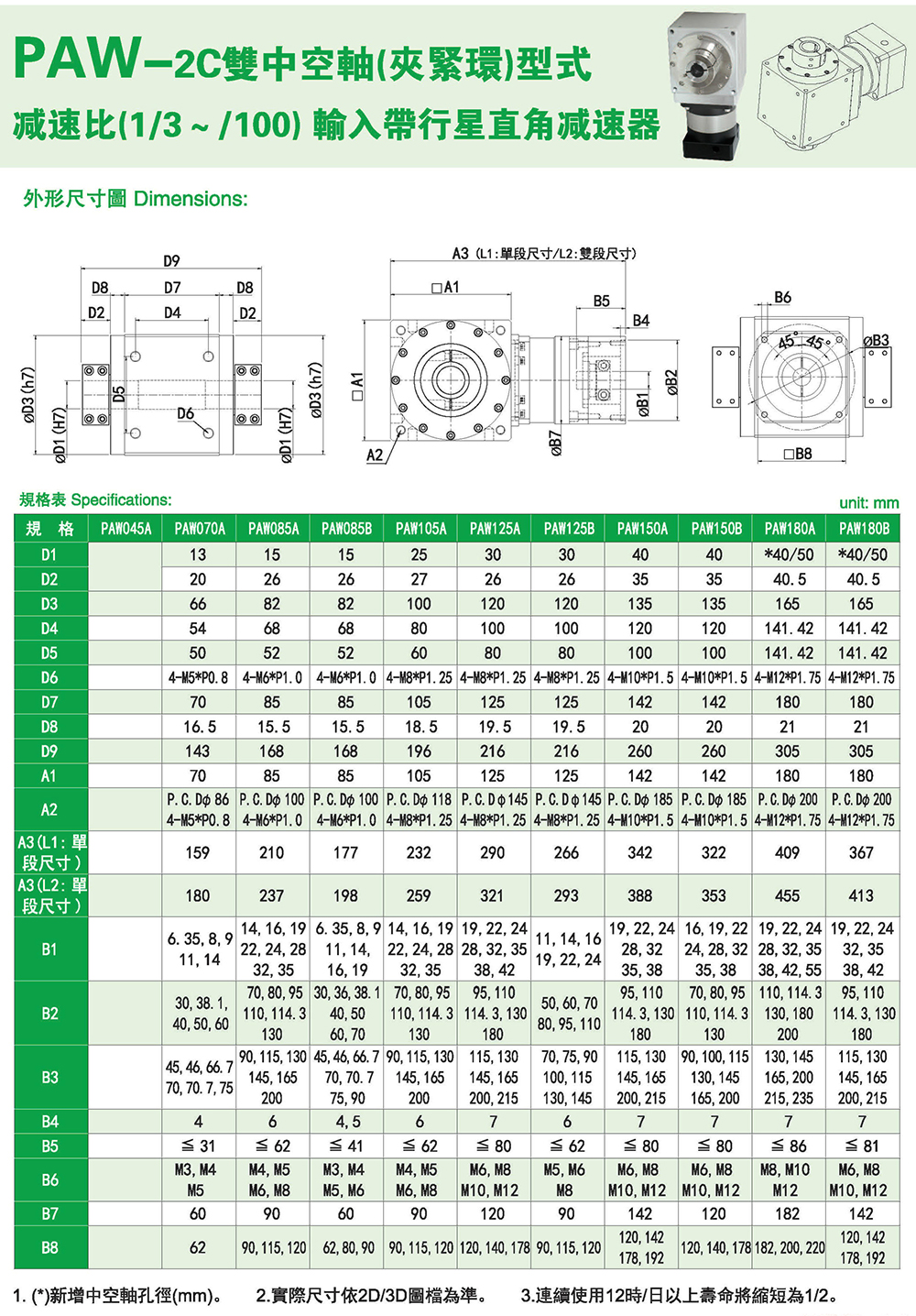 多樣化:輸出軸種類多樣化,有單出力軸型、雙出力軸型、中空軸型、中空法蘭型、中空軸錐形緊迫性、螺桿直線型、螺牙直線型。