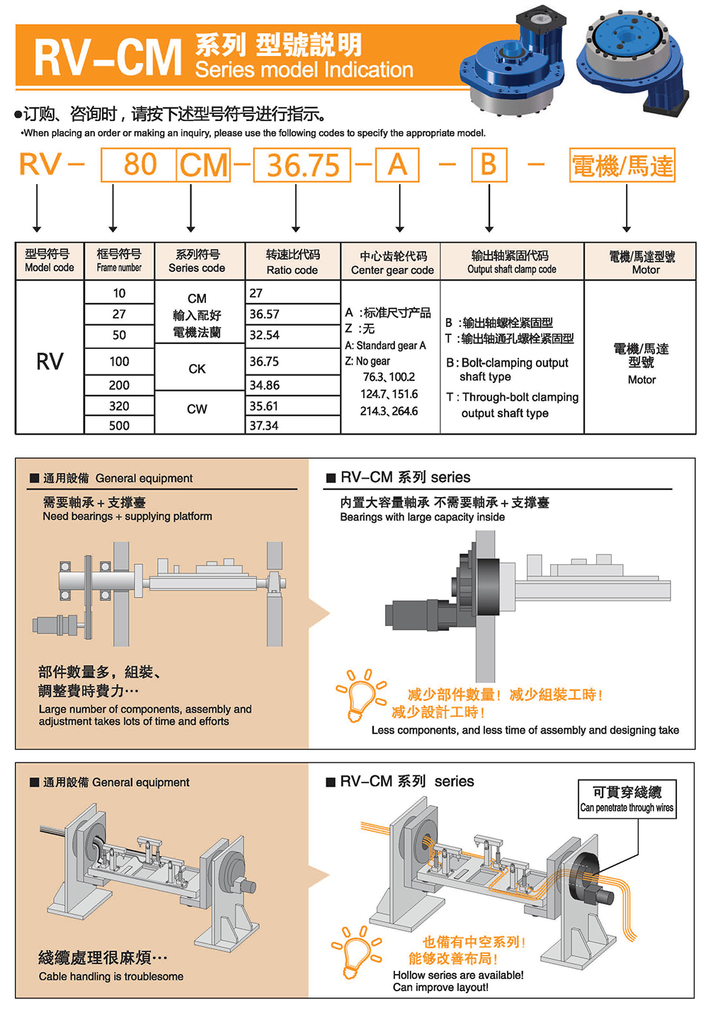 多樣化:輸出軸種類多樣化,有單出力軸型、雙出力軸型、中空軸型、中空法蘭型、中空軸錐形緊迫性、螺桿直線型、螺牙直線型。