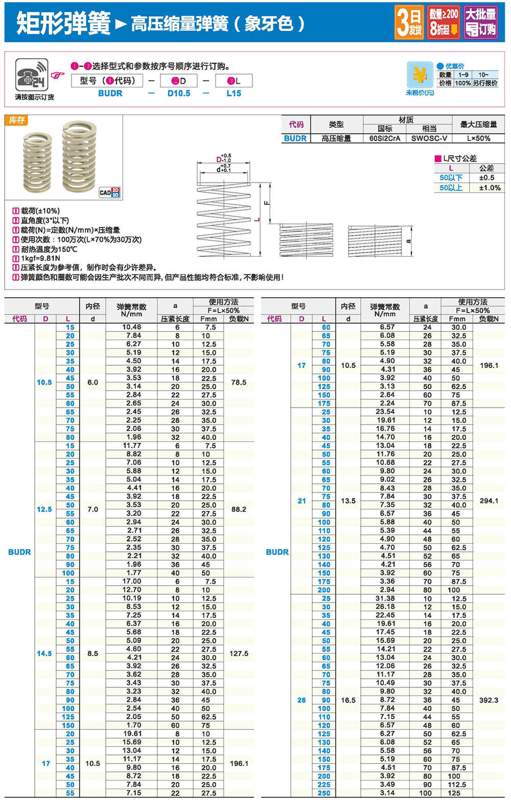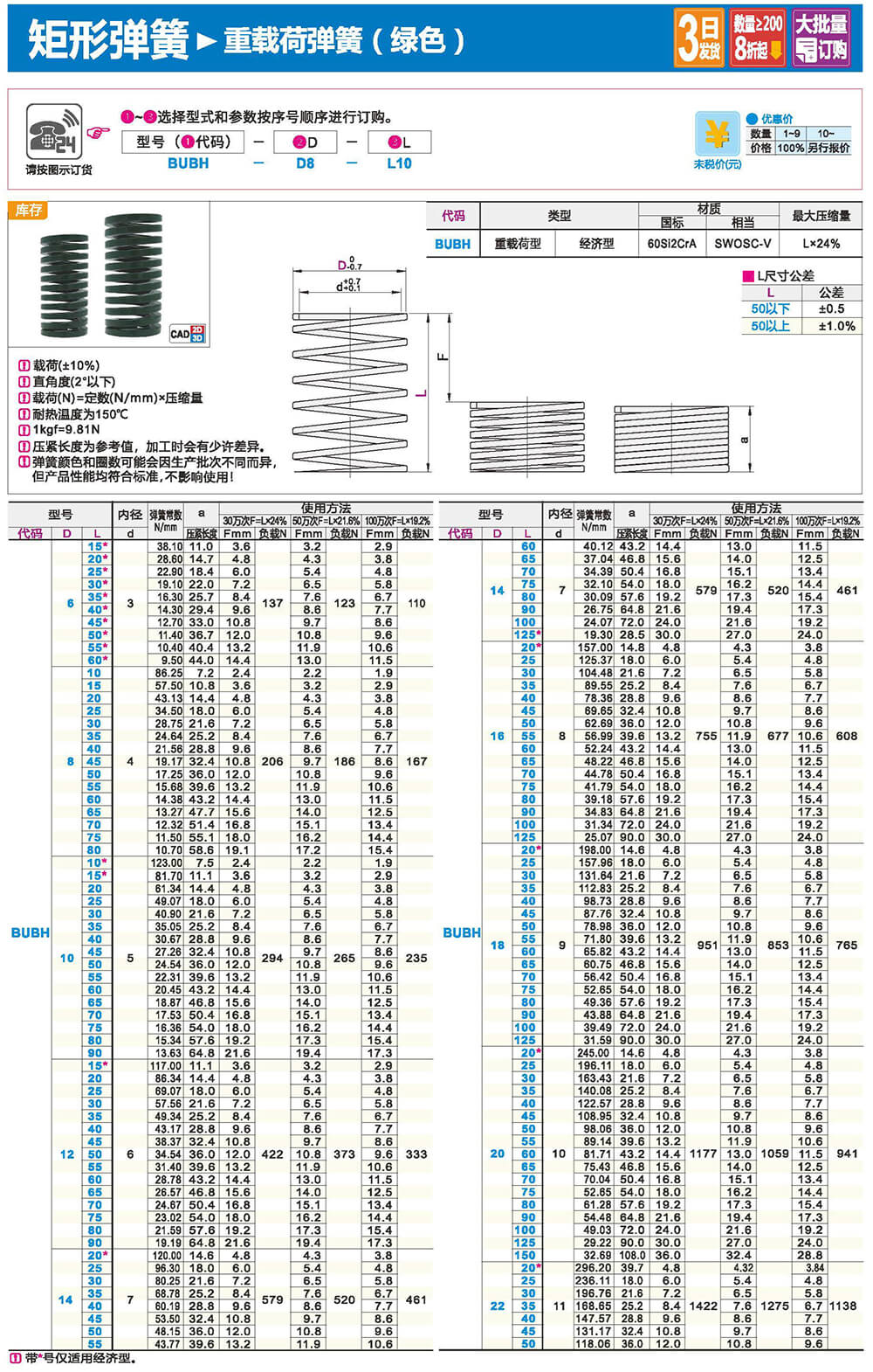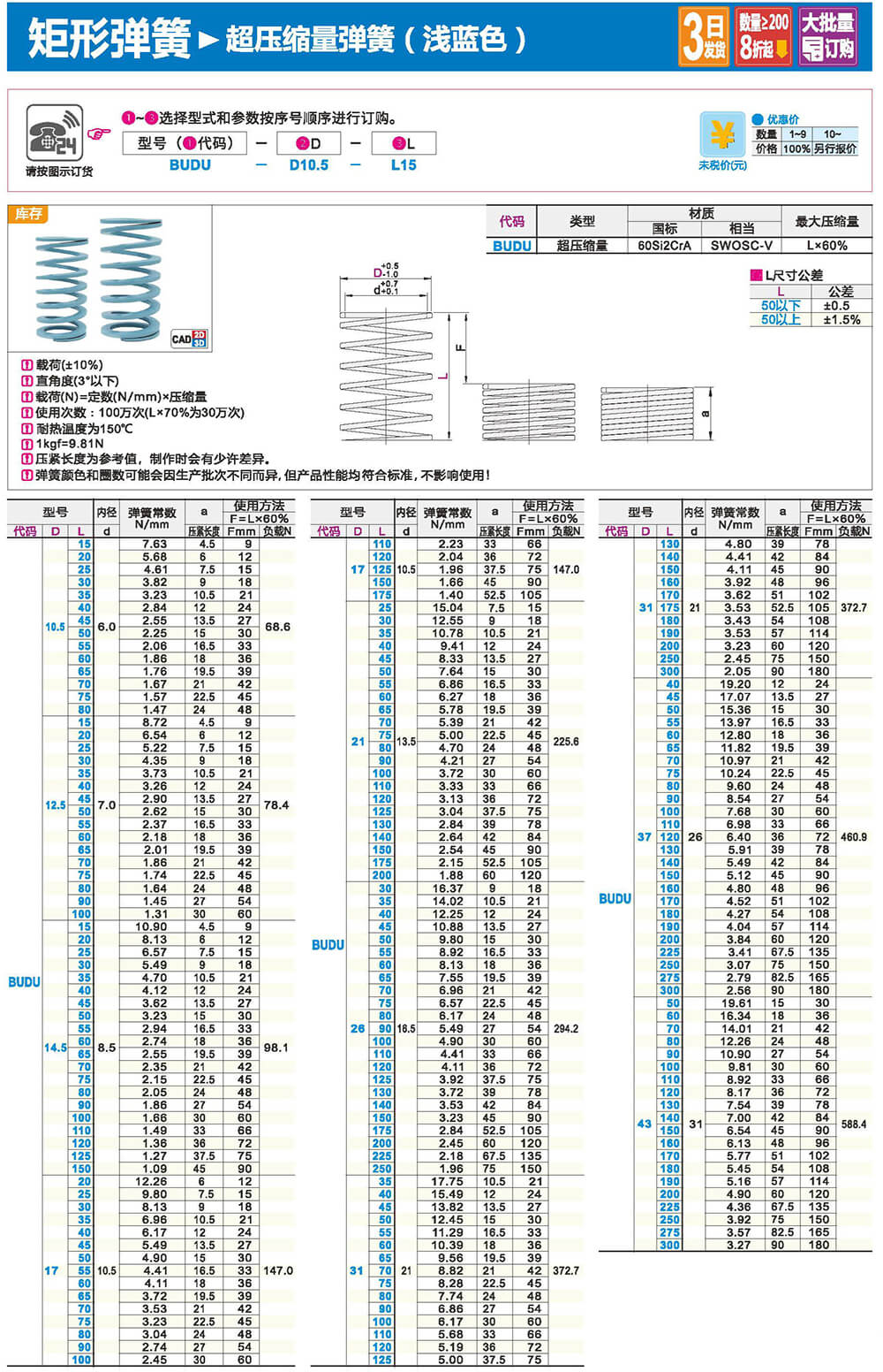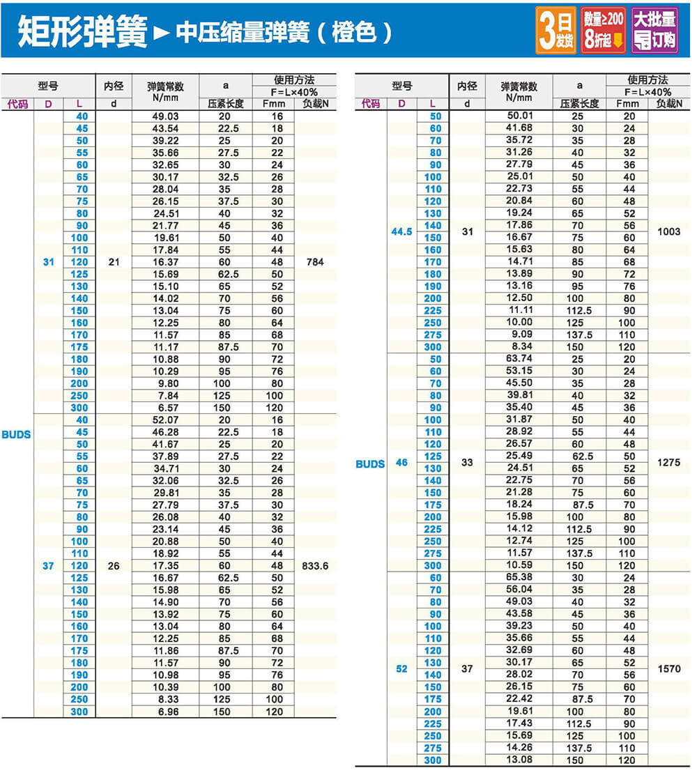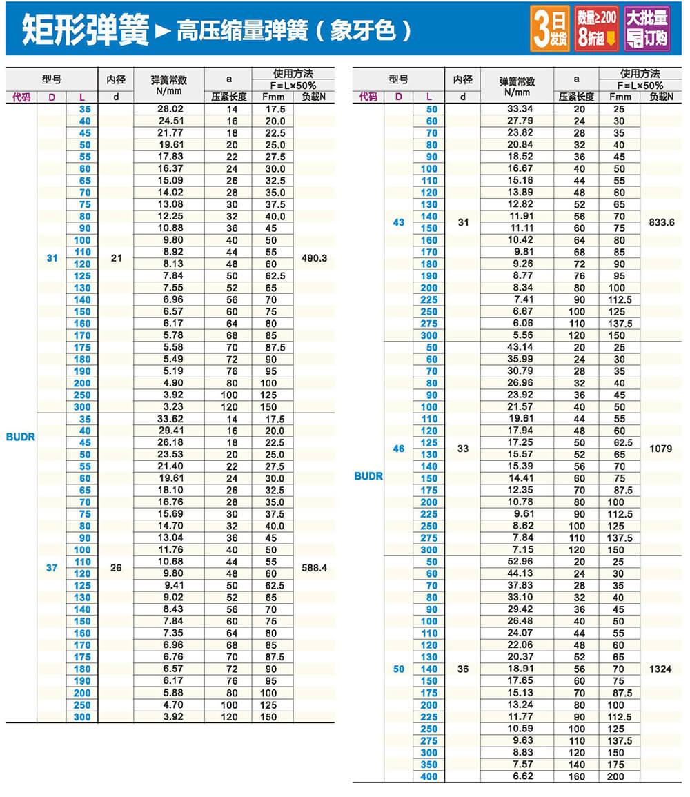 2.矩形截面壓縮彈簧:性質(zhì)和圓形截面圓柱螺旋彈簧相似,區(qū)別在于它所用的材料截面為矩形。在同樣空間條件下,矩形截面螺旋壓縮彈簧剛度更大,吸收的能量更多。