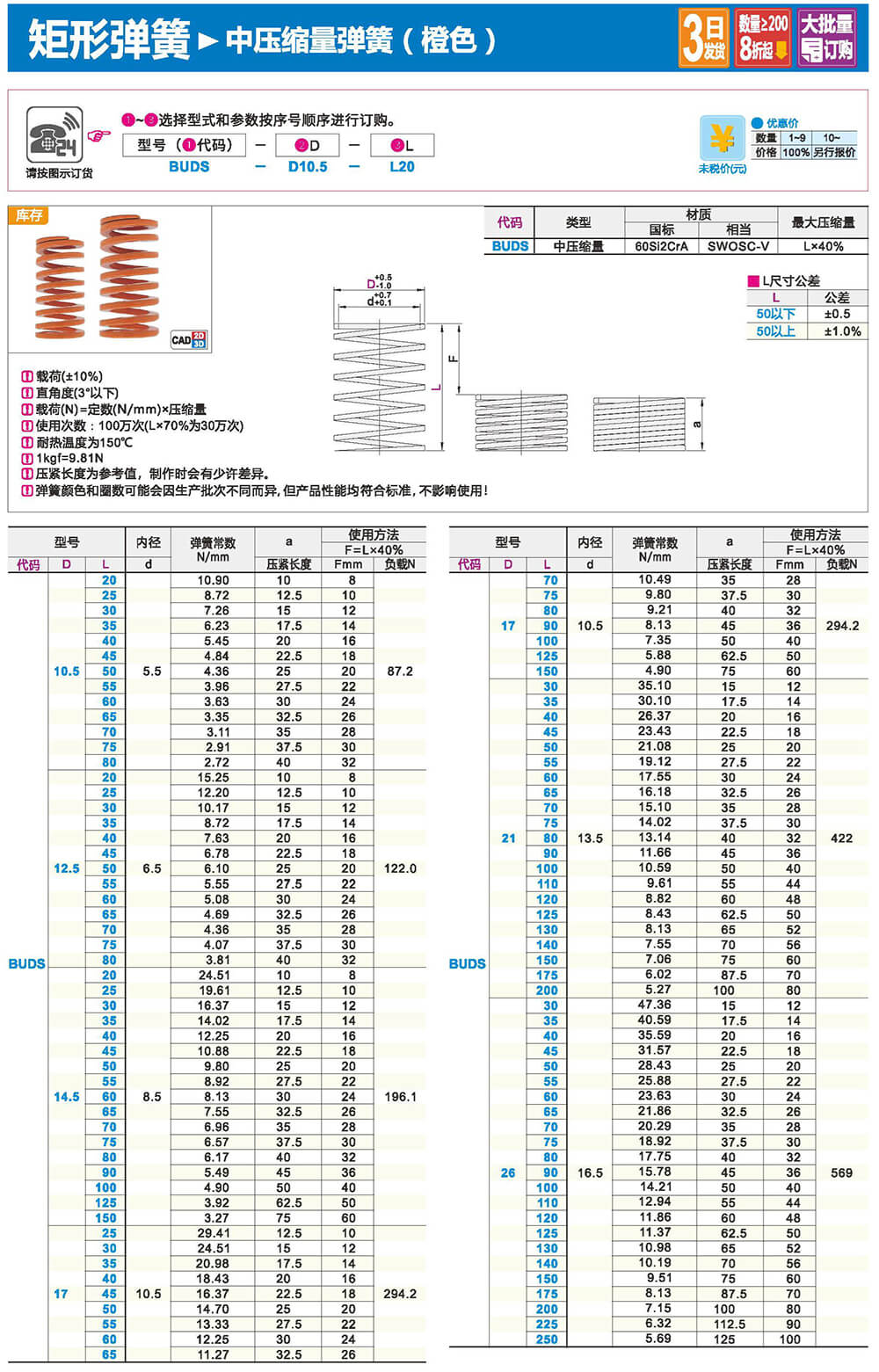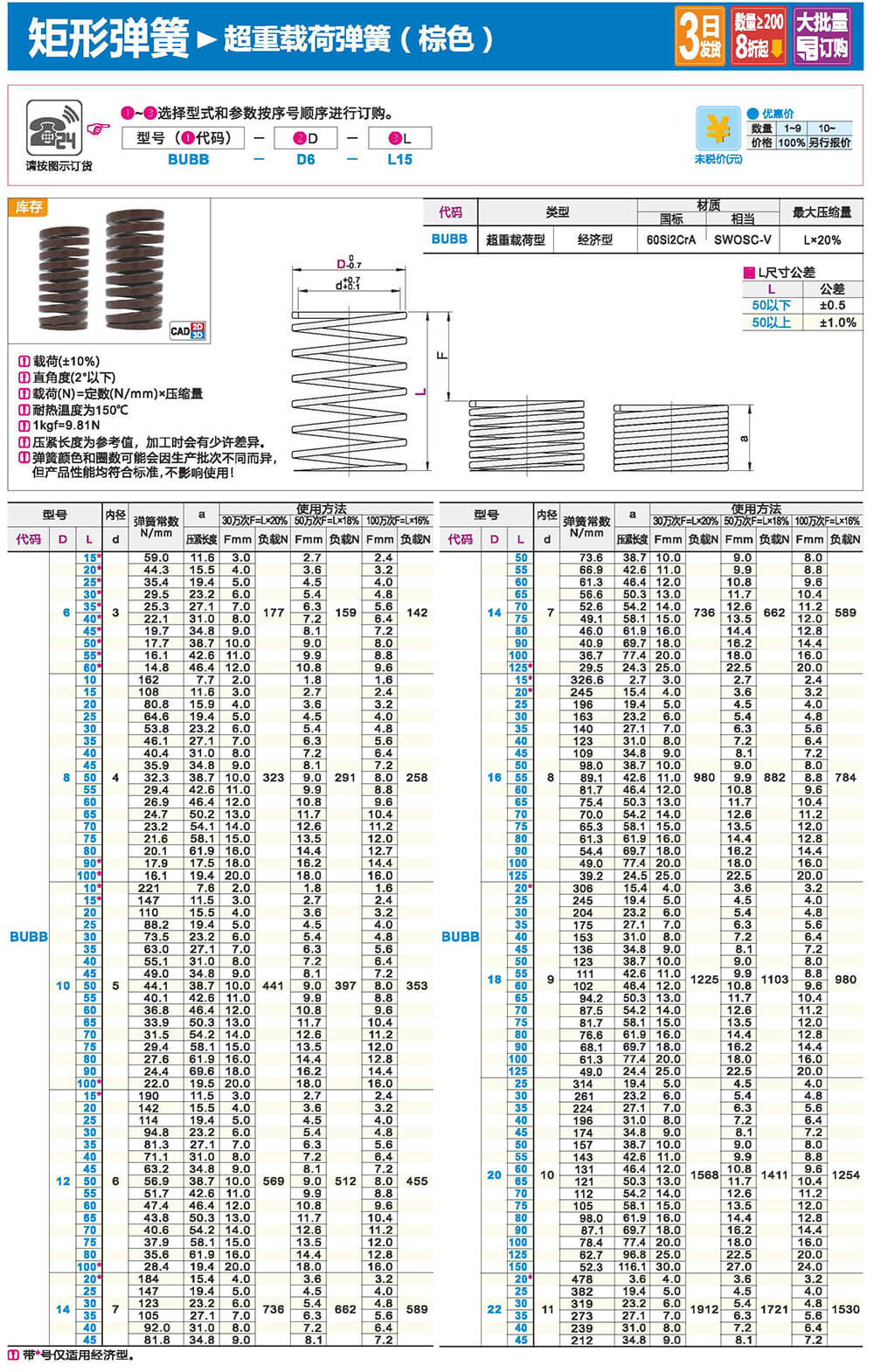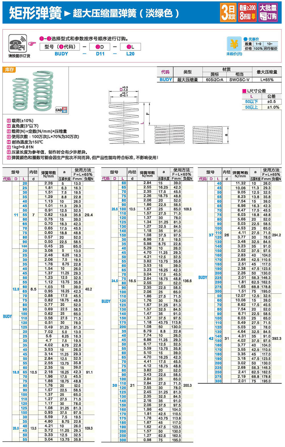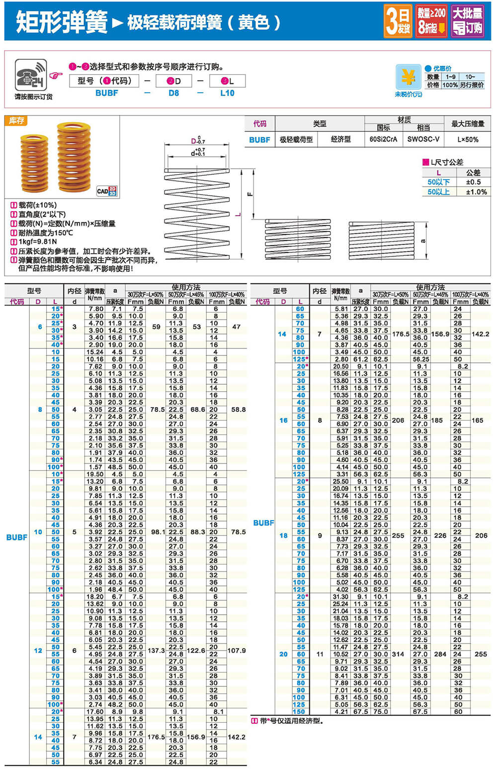 2.矩形截面壓縮彈簧:性質(zhì)和圓形截面圓柱螺旋彈簧相似,區(qū)別在于它所用的材料截面為矩形。在同樣空間條件下,矩形截面螺旋壓縮彈簧剛度更大,吸收的能量更多。