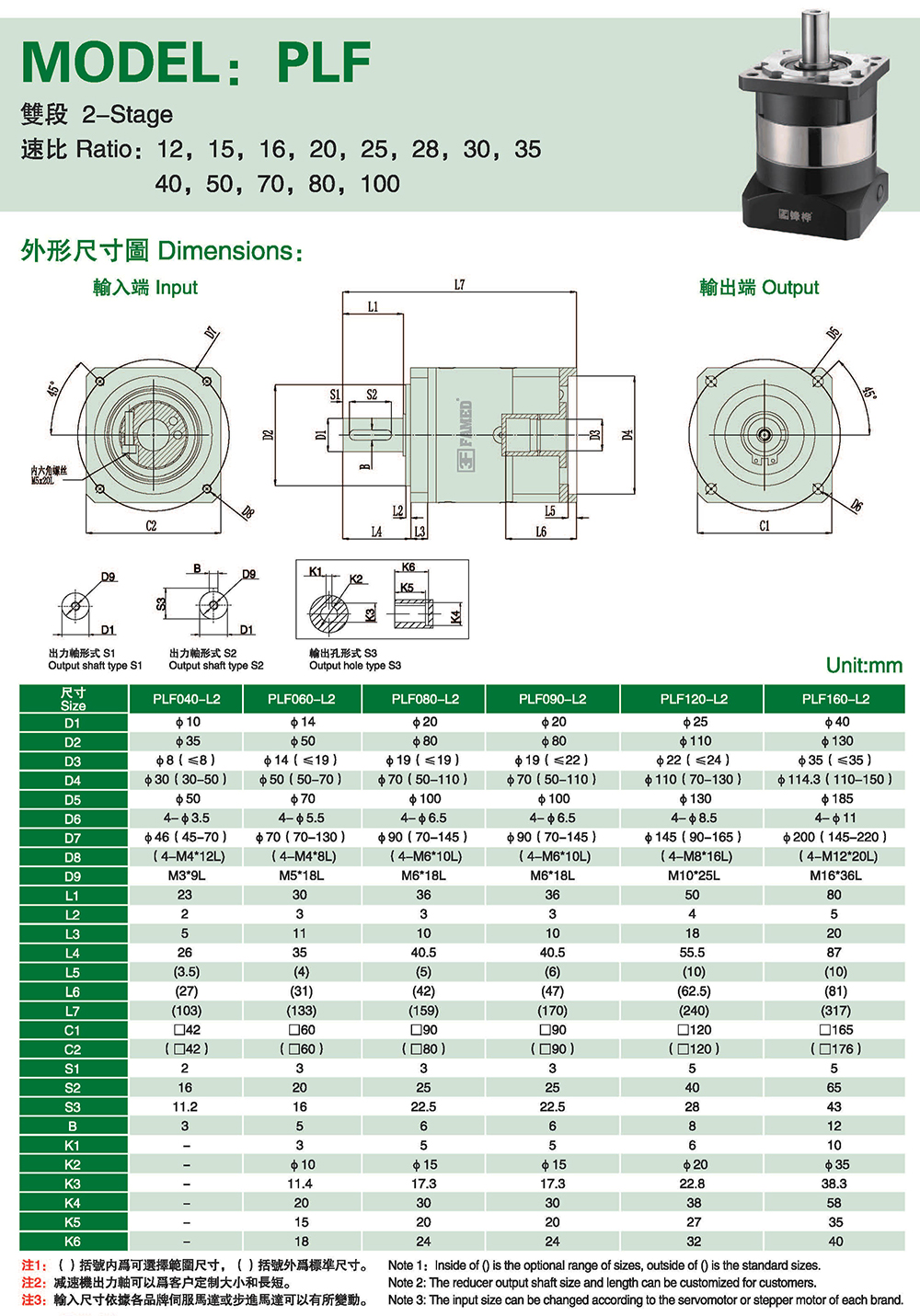 多樣化:輸出軸種類多樣化,有單出力軸型、雙出力軸型、中空軸型、中空法蘭型、中空軸錐形緊迫性、螺桿直線型、螺牙直線型。