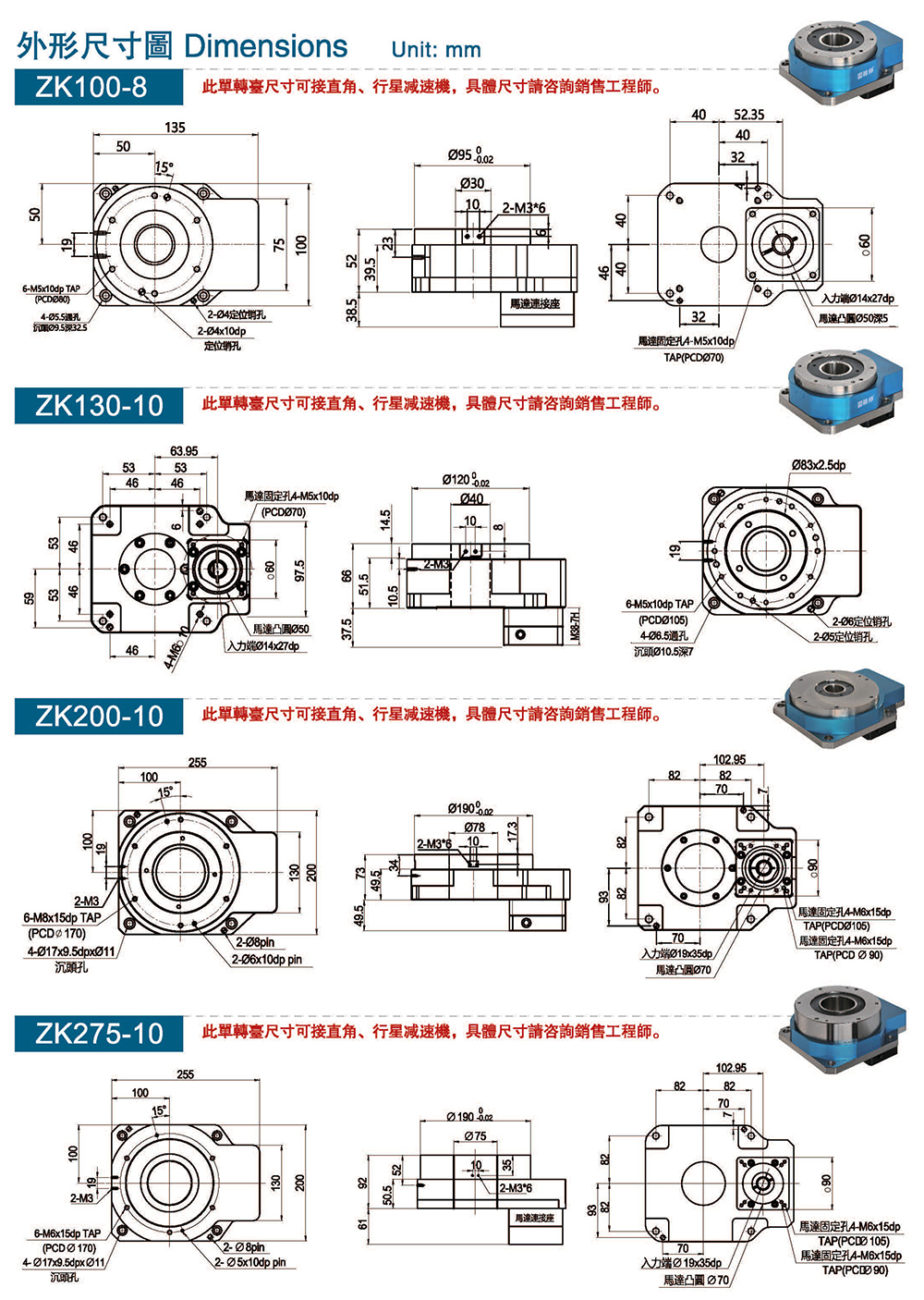 多樣化:輸出軸種類多樣化,有單出力軸型、雙出力軸型、中空軸型、中空法蘭型、中空軸錐形緊迫性、螺桿直線型、螺牙直線型。