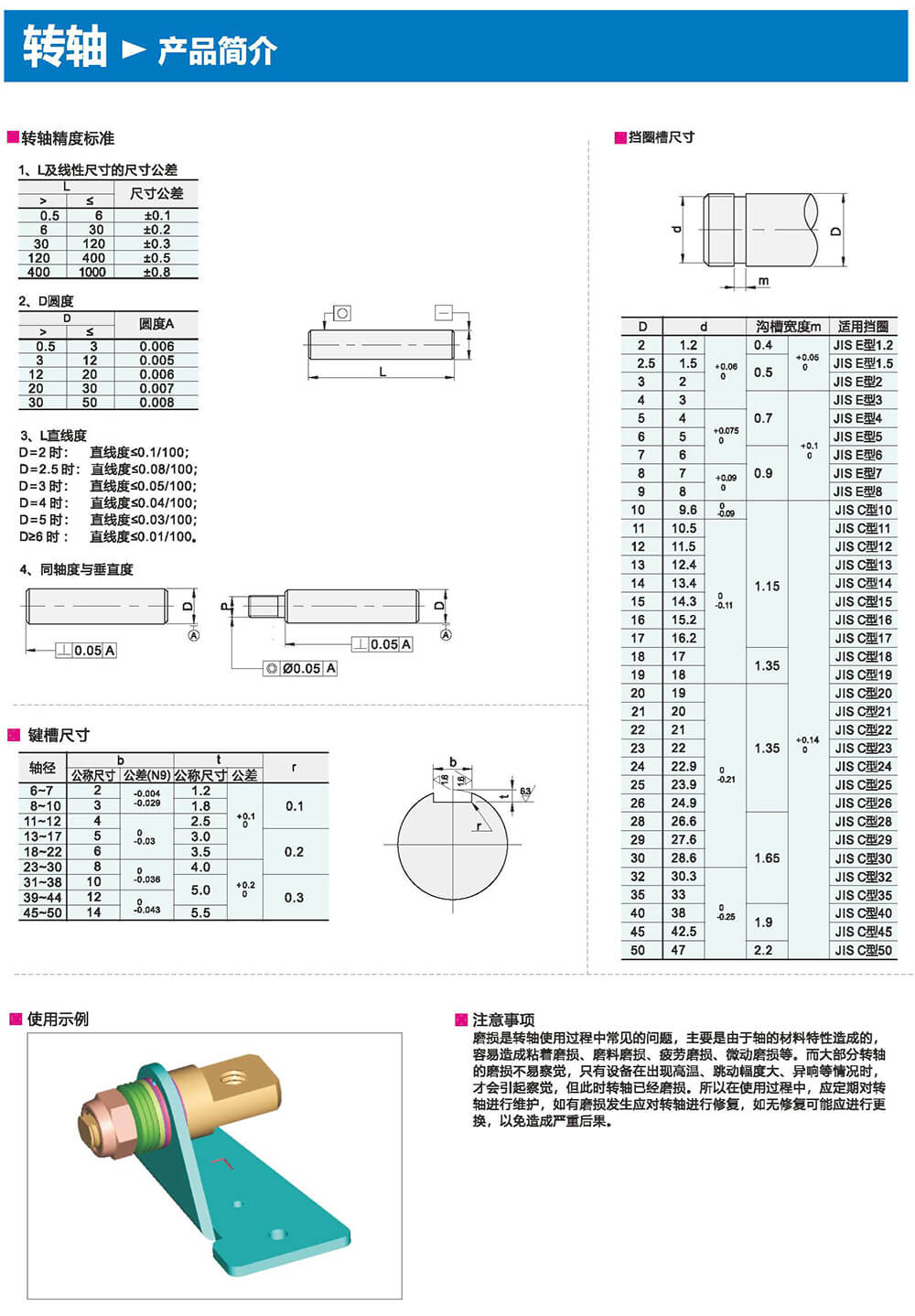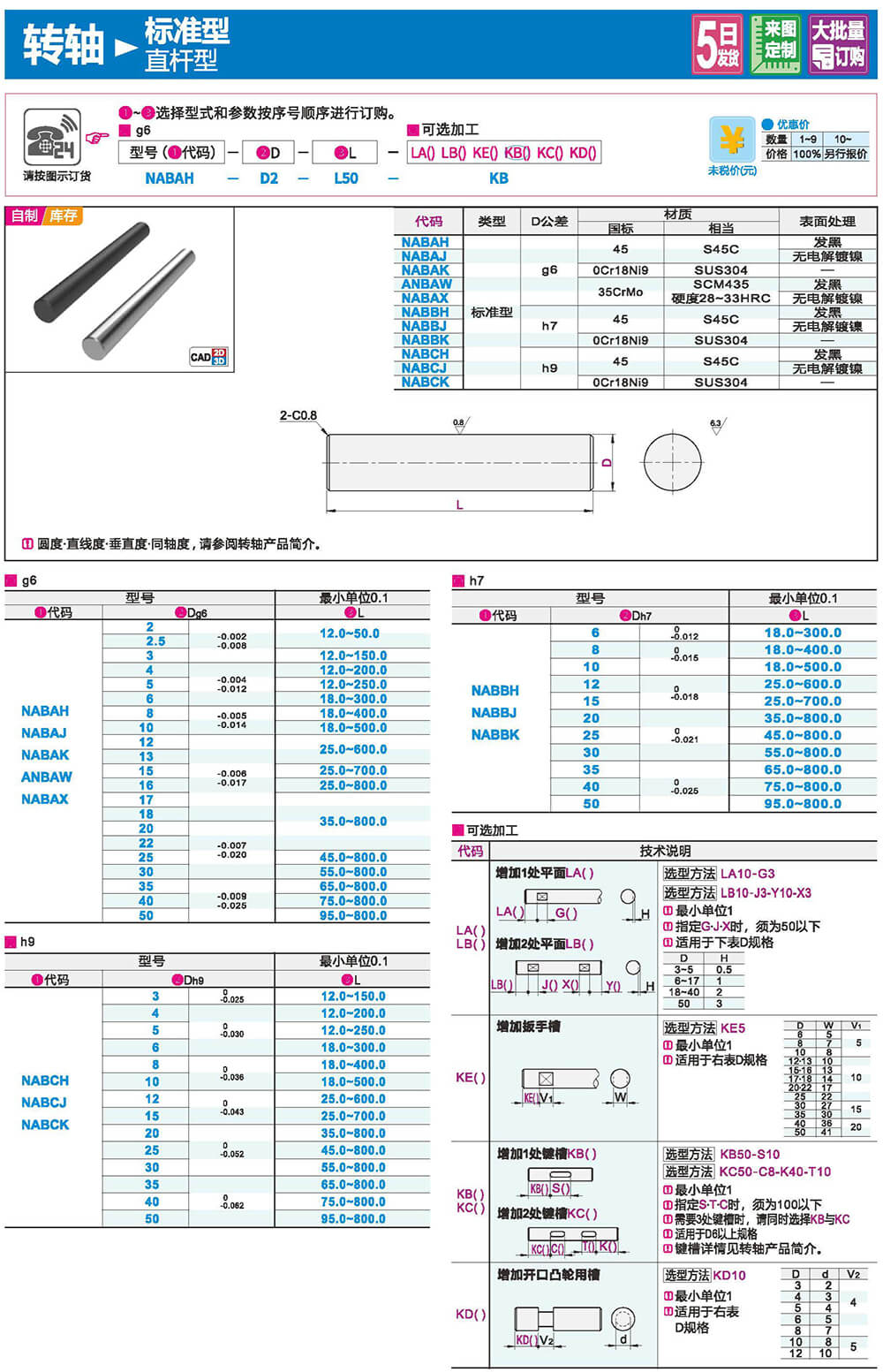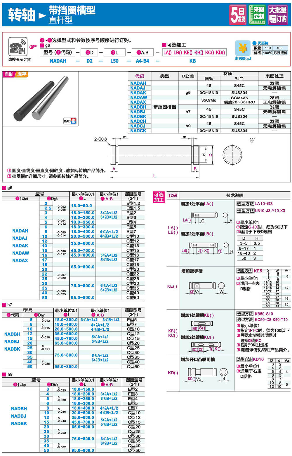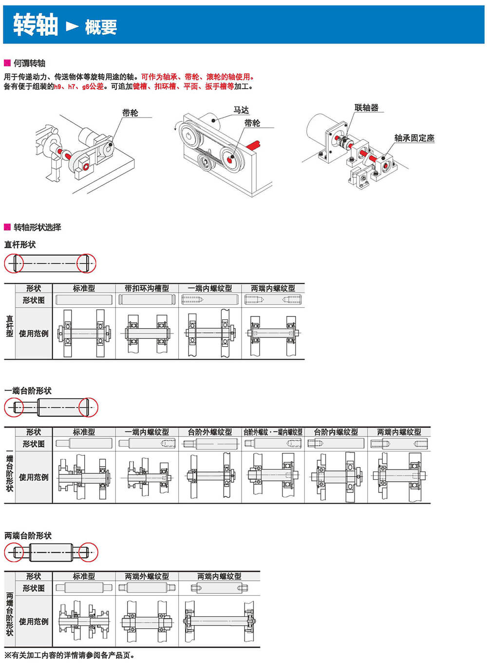 用于傳遞動力、傳送物體等旋轉(zhuǎn)用途的軸。可作為軸承、帶輪、滾輪的軸使用。 備有便于組裝的h9、h7。g6公差??勺芳渔I槽、扣環(huán)槽。平面、扳手槽等加工。