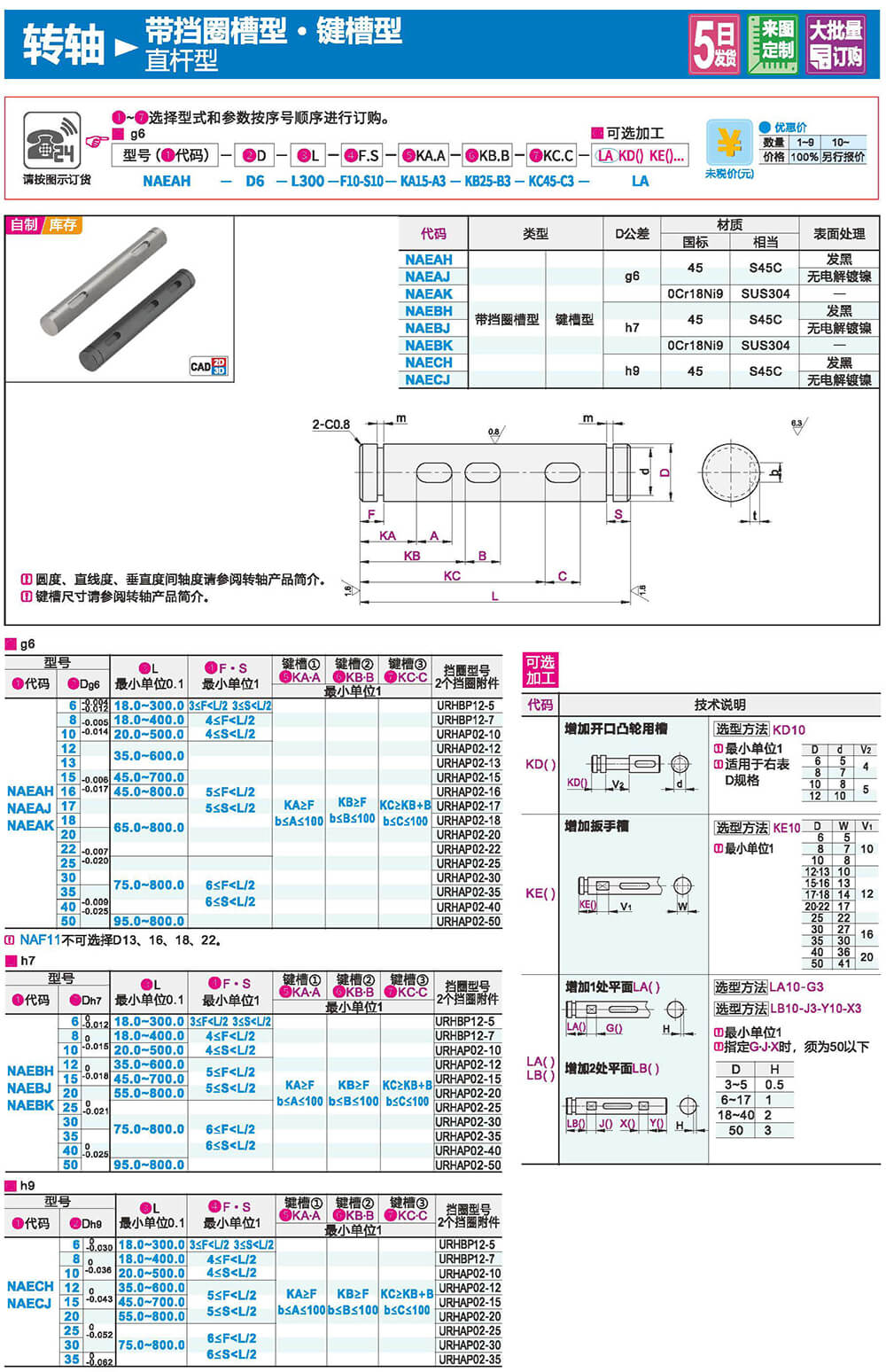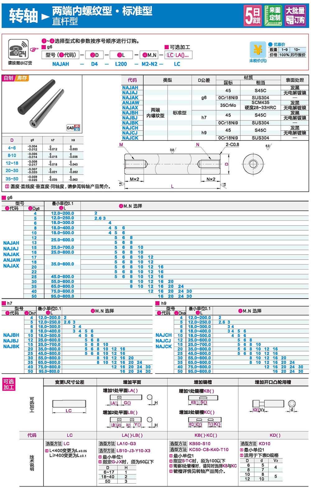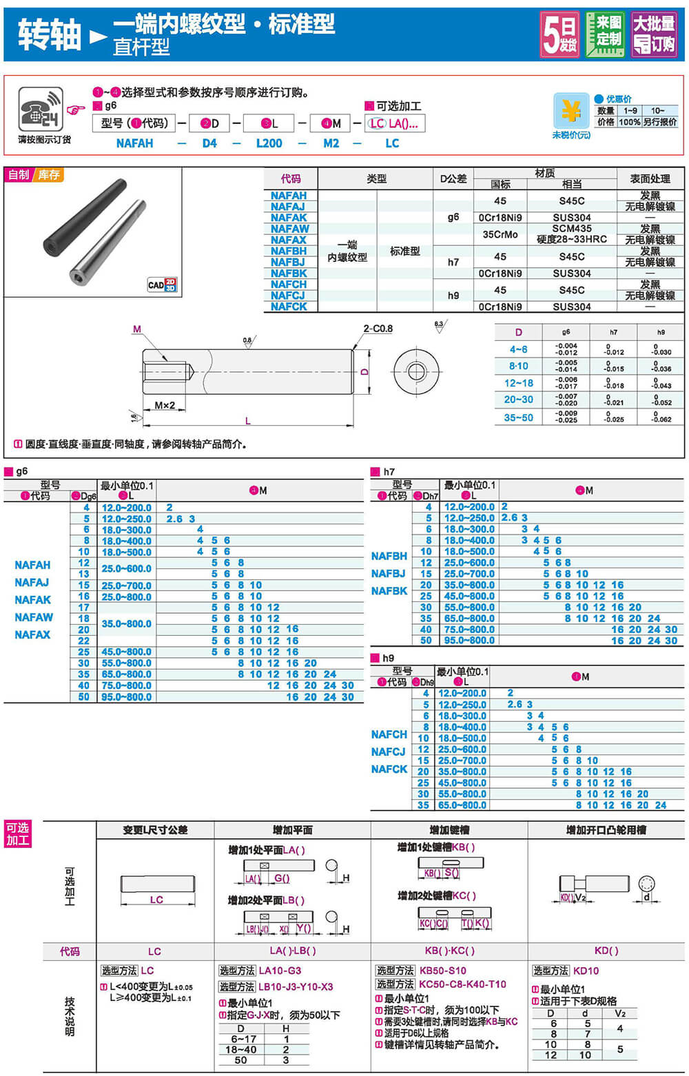 用于傳遞動力、傳送物體等旋轉(zhuǎn)用途的軸。可作為軸承、帶輪、滾輪的軸使用。 備有便于組裝的h9、h7。g6公差??勺芳渔I槽、扣環(huán)槽。平面、扳手槽等加工。