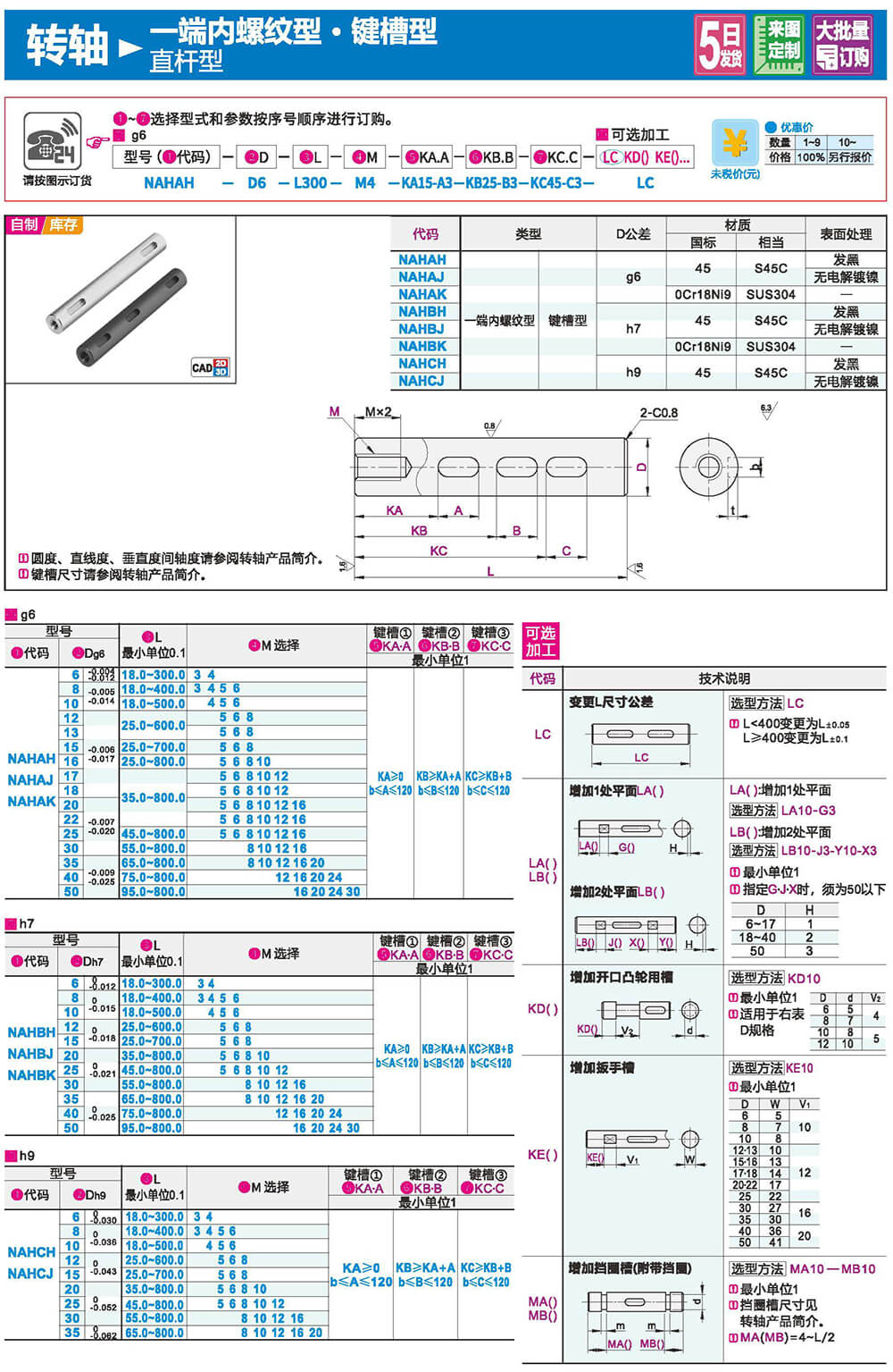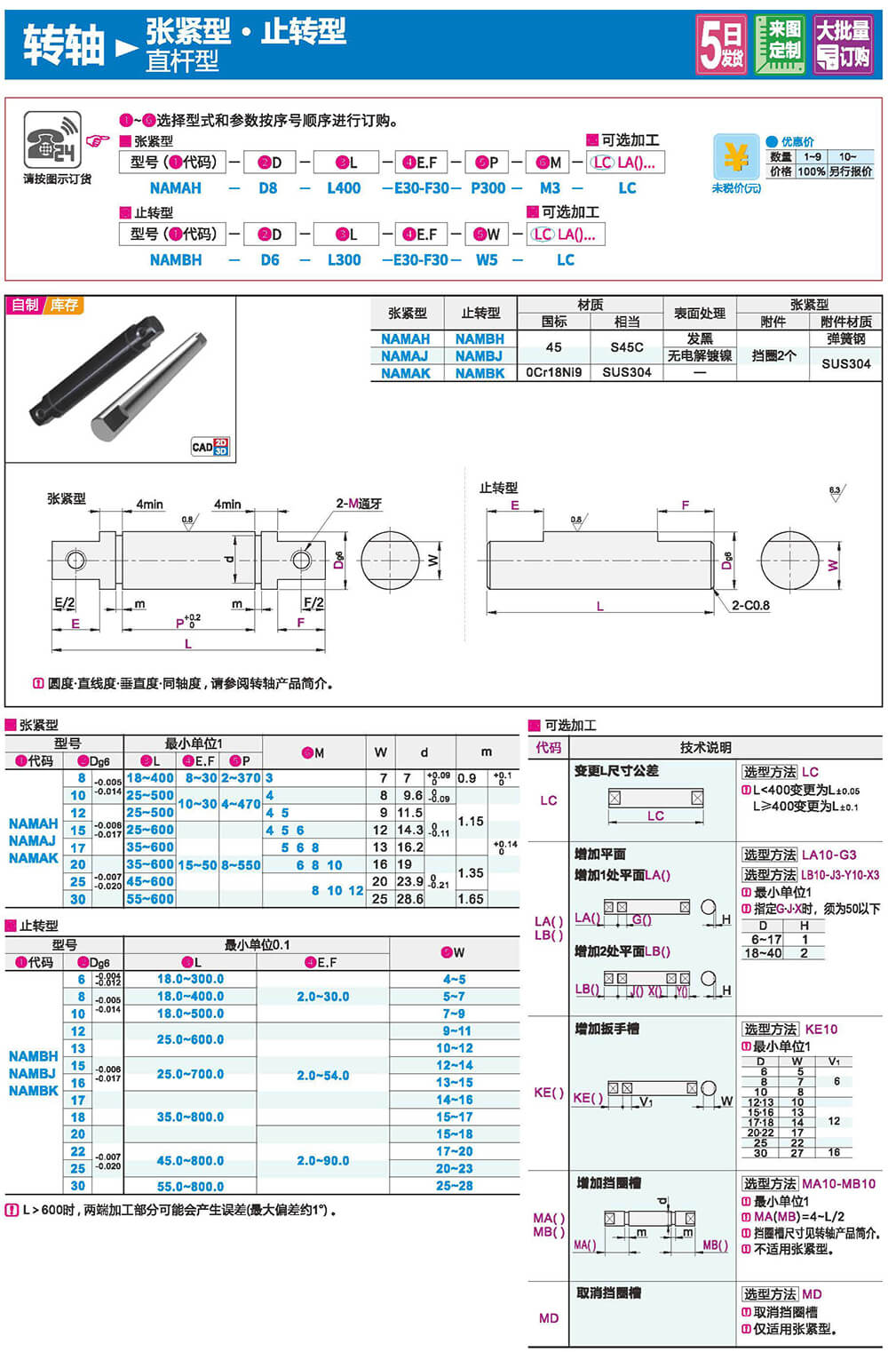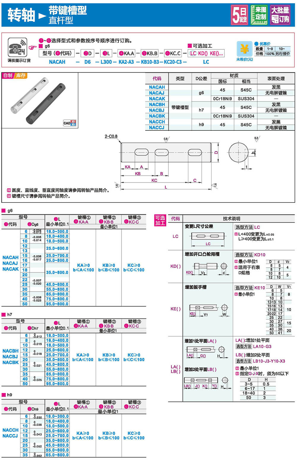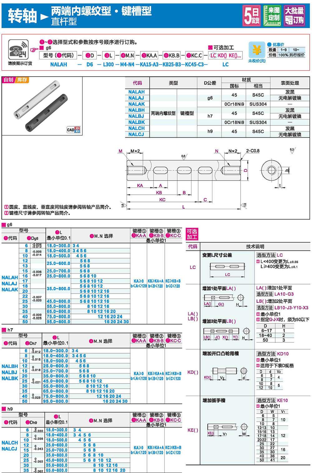用于傳遞動力、傳送物體等旋轉(zhuǎn)用途的軸。可作為軸承、帶輪、滾輪的軸使用。 備有便于組裝的h9、h7。g6公差??勺芳渔I槽、扣環(huán)槽。平面、扳手槽等加工。